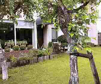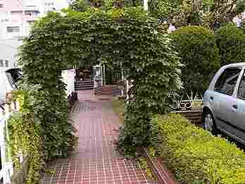 ![]() 駐車場からペンションへ行くと右側に 中庭があって、白樺が印象的だ。 突き当たりが玄関だが、大都会とは思えない |
